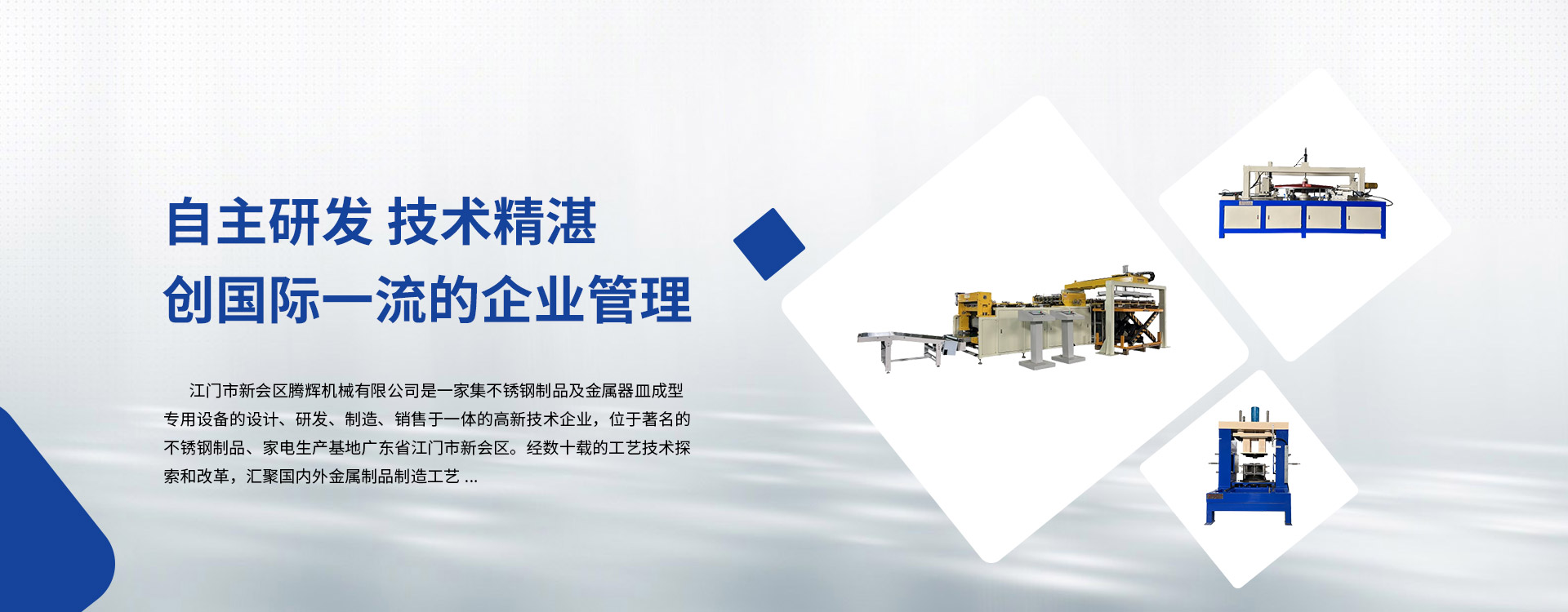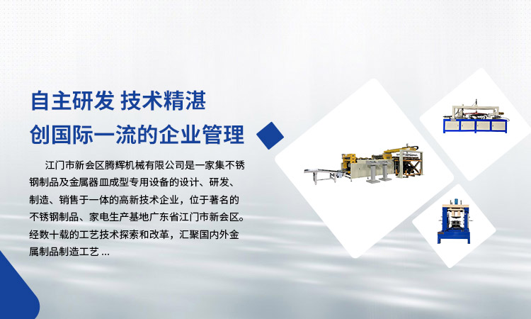 江門(mén)市新會(huì)區(qū)騰輝機(jī)械有限公司是一家集不銹鋼制品及金屬器皿成型專用設(shè)備的設(shè)計(jì)、研發(fā)、制造、銷售于一體的高新技術(shù)企業(yè),位于著名的不銹鋼制品、家電生產(chǎn)基地廣東省江門(mén)市新會(huì)區(qū)。經(jīng)數(shù)十載的工藝技術(shù)探索和改革,匯聚國(guó)內(nèi)外金屬制品制造工藝。